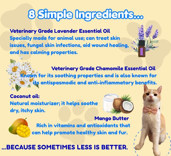 Helping your pet's skin issues holistically with a multipurpose formula for Cats & dogs. Our balm is enriched with veterinary grade lavender and chamomile essential oils.
